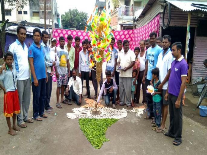 सोलापूर, दि. 15 - सोलापुरातील मोदी खाना चौकात आगळ्यावेगळ्या पद्धतीनं स्वातंत्र्य दिन साजरा करण्यात येत आहे. सोलापूर ही कलावंतांची नगरी. याचं उदाहरण स्वातंत्र्य दिनानिमित्त पाहायला मिळाले. मोदी खाना चौकात नवोदित नगर येथे गवंडी काम करणारा अंबादास म्हेत्रे यांनी फळभाज्यांचा वापर करत देशाचा नकाशा साकरला.