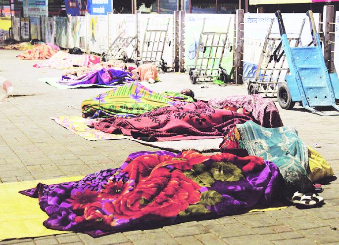 04) रेल्वे स्टेशन कोविडच्या संकटामुळे पूर्ण क्षमतेने रेल्वे गाड्या सुरू नसल्या तरी काही मोजक्याच गाड्या सुरू आहेत. दीड वाजण्याच्या सुमारास या परिसरात शुकशुकाट होता, पण स्टेशनच्या बाहेरील बाजूस ३०-४० प्रवासी आपल्या बॅगा डोक्याखाली घेऊन झोपी गेली होती. साधला असता त्यांनी सोलापुरात आल्यावर रात्रीची संचारबंदी असल्याचे समजले, कोणत्याच वाहनांची सुविधा होत नसल्याने आम्ही इथेच झोपण्याचे ठरवले असून, सकाळीच घरी जाणार असल्याचे सांगितले.