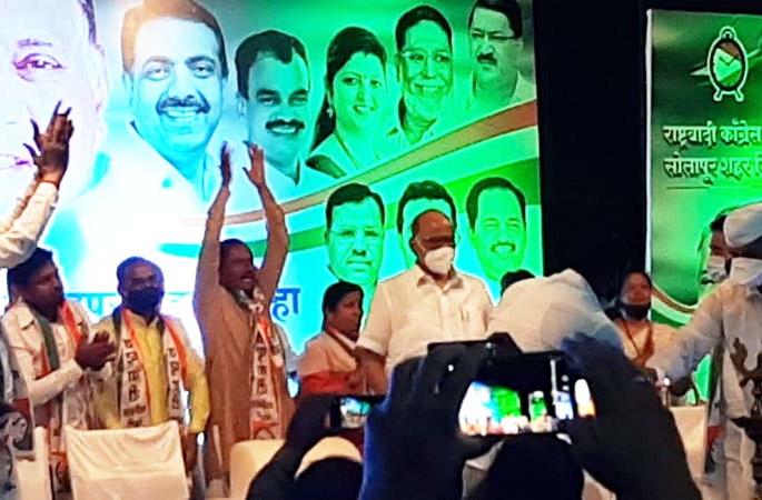 मनपा निवडणुकीच्या पार्श्वभूमीवर शरद पवार यांच्या उपस्थितीत राष्ट्रवादी काँग्रेसच्या कार्यकर्त्यांचा मेळावा झाला. पवार म्हणाले, महापालिका चुकीच्या लोकांच्या हातात गेली. त्याचा विपरीत परिणाम शहरावर झालेला दिसतो. हे चित्र बदलण्यासाठी राष्ट्रवादी काँग्रेसच्या कार्यकर्त्यांनी आघाडीवर असले पाहिजे. राष्ट्रवादीच्या नेत्यांसोबत सकाळी माझी बैठक झाली . या बैठकीत भाजप वगळून इतर सर्व पक्षांची एकजूट करता आली तर करा असे मी सांगितले. पण ही एकजूट सन्मानाने झाली पाहिजे. महापालिका निवडणुकीत अनुभवी लोकांसोबतच तरुण कार्यकर्त्यांना उमेदवारी द्या, असे आवाहन त्यांनी केले. या मेळाव्यात काँग्रेसच्या माजी महापौर नलिनी चंदेले, ज्येष्ठ नेते सुधीर खरटमल यांच्यासह इतर नेत्यांनी राष्ट्रवादीमध्ये प्रवेश केला.
