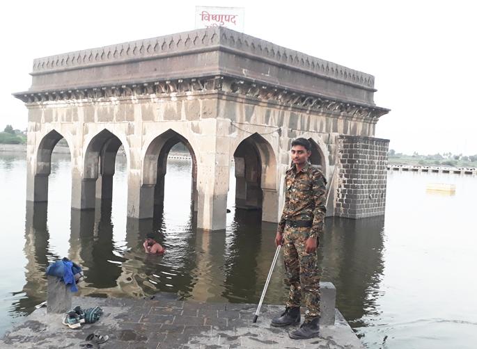 पंढरपूर : सोलापूरला पाणीटंचाई जाणवू लागल्यानंतर उजनी धरणातून भीमा नदीत पाणी सोडण्यात आले आहे. पंढरीतील चंद्रभागा पात्रात पाणी जास्त दिवस टिकून रहावे यासाठी गोपाळपूर बंधारा दारे टाकून अडविण्यात आला आहे, परिणामी जवळच असलेल्या विष्णूपद मंदिराला पाण्याने वेढले आहे. त्यामुळे याठिकाणी दर्शनासाठी भाविकांची गर्दी असते. त्यामुळे येथे कोणत्याही प्रकारची दुर्घटना घडू नये यासाठी मंदिर समितीच्या वतीने दोन सुरक्षा रक्षकांची नेमणूक करण्यात आली आहे.