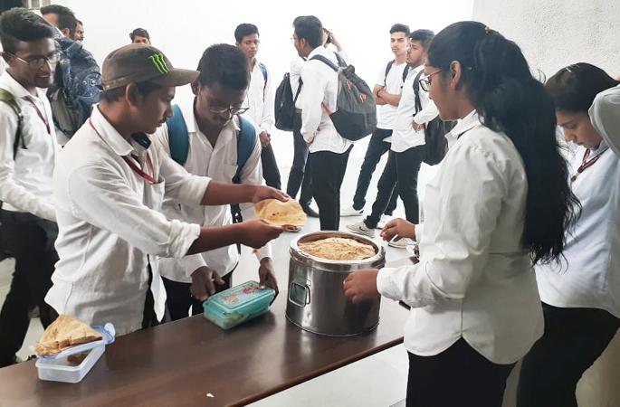सोलापूर : वेळ सकाळी पावणे नऊची.. स्थळ एन.के. आॅर्किड अभियांत्रिकी महाविद्यालयाचा परिसर.. विद्यार्थी महाविद्यालयाच्या व्हॅनमधून.. कुणी बाईकवरुन कॉलेजला येत आहेत... हे सर्व विद्यार्थी आपापल्या डिपार्टमेंटला जात असताना डिपार्टमेंटच्या प्रवेशद्वाराजवळ स्वयंसेवक थांबलेले.. त्यांच्या हातात चपाती कलेक्ट करण्यासाठीची भांडी.. विद्यार्थी आपापल्या डब्यांमधून चपाती काढतात आणि स्वयंसेवकांकडे देतात. हे करताना त्यांच्या चेहºयांवरील आनंदाचे संमिश्र भाव खूप काही सांगून जाणारे. समाजासाठी आपणही काही देणं लागतो या भावनेतून आपला स्वत:चा खारीचा वाटा उचलतानाचे आनंदाचे भाव निश्चितच बरंच काही सांगून गेले.