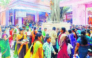 अक्कलकोट: ‘जन्मोजन्मी हाच पती मिळो’ अशी स्वामी समर्थांकडे प्रार्थना करीत अक्कलकोट शहर तालुक्यातील सुवासिनींनी वडाला फेऱ्या मारुन स्वामी समर्थांचे दर्शन घेतले. शहर-ग्रामीण भागातही हा सण उत्साहात साजरा करण्यात आला. स्वामी समर्थ मंदिरात पहाटेपासूनच विधिवत पूजेनंतर भाविकांसाठी मंदिर खुले केले होते. दुपारी १२ पर्यंत गर्दी तुरळक होती; मात्र त्यानंतर वटपौर्णिमेनिमित्त हजारो सुवासिनींच्या दर्शनासाठी रांगा लागल्या होत्या. दरपौर्णिमेला येणारे भक्तगण आणि आज वटपौर्णिमेमुळे भाविकांच्या गर्दीत वाढ झाल्याचे दिसून आले. स्वामी समर्थ मंदिरात ज्या वडाच्या झाडाखाली स्वामी समर्थांनी २२ वर्षे तपश्चर्या केली त्या पवित्रा वडाच्या झाडाभोवती फेऱ्या मारुन हजारो सुवासिनींनी ‘जन्मोजन्मी हाच पती मिळू दे’ असे औक्षण करत स्वामी समर्थांकडे आशीर्वाद मागितले. खास वटसावित्री सण साजरा करण्यासाठी परजिल्ह्यातूनही महिला आल्या होत्या.मंदिर परिसराला जत्रेचे स्वरुप प्राप्त झाले होते. शहरातील प्रमिला पार्क, विजय गणपती, राजेराय मठ, शिवपुरी, नवीन राजवाडा, हन्नूर रोड, सोलापूर रोडवरील वडाच्या झाडाला फेऱ्या मारुन वटसावित्री उत्सव साजरा केला.------------------------भक्तनिवास हाऊसफुल्लवटपौर्णिमेचे औचित्य साधून परगावाहून येणाऱ्या भक्तगणांनी अक्कलकोट शहरात एकच गर्दी केली होती. एक दिवस अगोदरच मंदिर समिती, अन्नछत्र मंडळाच्या भक्तनिवासातील सर्व खोल्या बूक झाल्या होत्या. शहरातील अन्य लॉजवरही गर्दी दिसून आली. भाविकांना दर्शन सुलभ व्हावे म्हणून मंदिर समितीचे विश्वस्त महेश इंगळे, विलास फुटाणे, सुभाष शिंदे, आत्माराम घाटके, तुळशीदास आवटी, दयानंद हिरेमठ, राजू निलवाणी, अन्नछत्र मंडळात शाम मोरे, अमोल भोसले, अभय खोबरे, आप्पा हंचाटे आदींनी परिश्रम घेतले.