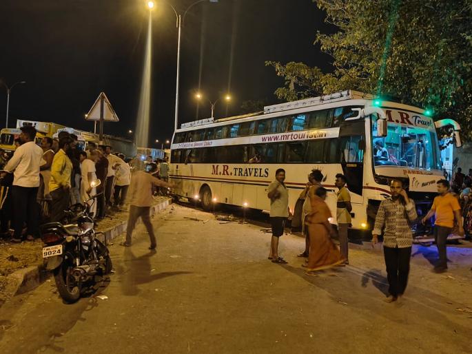 कर्नाटकातून शहापूरमार्गे सायंकाळी ६ वाजेच्या सुमारास खासगी ट्रॅव्हल प्रवाशांना घेऊन मुंबईच्या दिशाने निघाली होती. सोमवारी रात्री १०:१५च्या सुमारास बसने मार्केट यार्ड पार केले. धोत्रीकर वस्तीजवळील रोड पार करीत असताना समोरून एक पादचारी रस्ता पार करीत होता. त्याच्या वाचवण्यासाठी चालकाने बस सर्व्हिस रोडच्या दिशेनं वळवली. डिव्हायडर तोडून सर्व्हिस रोडकडे गेली. बसमधील प्रवाशांना काय होतेय काही कळेना. चालकाने प्रसंगावधान राखून वेगावर नियंत्रण ठेवले अन्यथा ही बस थेट धोत्रीकर वस्तीमध्ये घुसून मोठा अनर्थ घडला असता, असे उपस्थित रहिवाशांकडून सांगण्यात आले.ब्रीजच्या मागणीसाठी वाहतूक ठप्पया रोडवर सातत्याने अपघात होत असताना प्रशासन आणि नॅशनल हायवे विभाग गांभीर्याने पहायला तयार नाही. या मार्गावर ब्रीज व्हावा यासाठी नगरसेवक सुरेश पाटील, काँग्रेसचे शहराध्यक्ष चेतन नरोटे यांनी रोडवर परिसरातील नागरिकांसह ठिय्या मांडल्याने हैदराबादहून मुंबई आणि मुंबईहून हैदराबादकडे जाणारी सर्व वाहतूक ठप्प झाली. प्रशासनाकडून ठोस कारवाई व्हावी म्हणून नागरिकांनी आक्रमक पवित्रा घेतला.पोलिसांच्या पवित्र्याने नागरिक संतापलेअपघाताची खबर मिळताच पोलिस घटनास्थळी धावले. मोठ्या प्रमाणात गर्दी झाल्याने जमावाला पांगवण्यासाठी पोलिसांनी केलेल्या लाठीमारामुळे परिसरातील नागरिक संतापल्याची भावना उपस्थितांमध्ये सुरू होती.