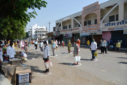 ६ मंडईतील गर्दी कमी करण्यासाठी बाळीवेस स्टेट बँक ते सम्राट चौकापर्यंत रस्त्याच्या दुतर्फा भाजी विक्रेत्यांना बसण्याची सोय करण्यात आली होती. ग्राहकांना फिजिकल डिस्टन्स पाळता यावे, यासाठी वर्तुळे आखण्यात आली होती. ग्राहक शिस्तबद्धरित्या भाजी खरेदी करताना दिसत होते. पोलीस प्रशासनाच्या वतीने वारंवार सूचना देण्यात येत होत्या.