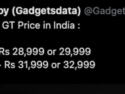 POCO F3 GT price: POCO F3 GT ची किंमत ट्वीटरवर लीक करण्यात आली आहे, या फोनच्या 8GB रॅम व्हेरिएंटची किंमत 28,999 किंवा 29,999 रुपये असेल.