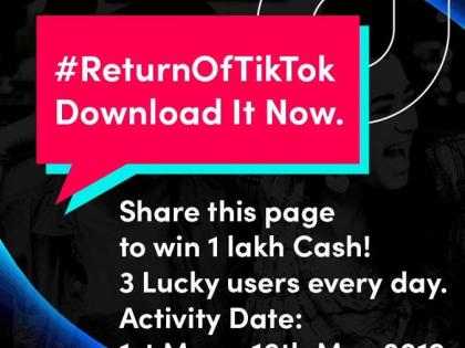 1 लाख रुपये जिंकण्यासाठी सोशल मिडीयावर #ReturnofTikTok शेअर करावे लागणार आहे. या मायक्रोसाईटमध्ये युजरला एक लिंक पाठविली जाईल. यानुसार iOS आणि अँड्रॉईडवर अॅप डाऊनलोड करू शकता. 1 ते 16 मे पर्यंत या स्कीममध्ये दररोज तीन जणांना विजेते घोषित केले जाणार आहे. त्यांना प्रत्येकी 1 लाख रुपये दिले जाणार आहेत.