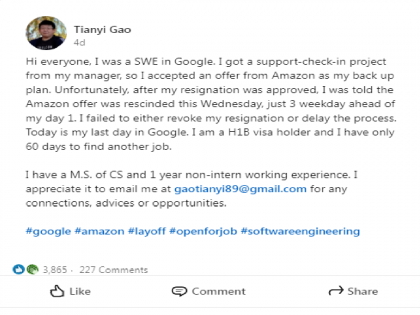 या इंजिनिअरने स्वत: LinkedIn वर एक पोस्ट शेअर करून आपली संपूर्ण कहाणी सांगितली आहे. त्याची गोष्ट ऐकल्यानंतर तुम्हीही म्हणाल- 'असं कुणासोबत होऊ नये'. त्याने आता गूगल आणि अॅमेझॉन, दोन्ही नोकऱ्या गमावल्या आहेत आणि आता त्याच्याकडे फक्त 60 दिवस शिल्लक आहेत. यादरम्यान त्याला दुसरी नोकरी मिळाली नाही, तर मायदेशात परतावे लागेल.