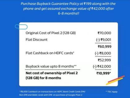 गुगल पिक्सल 2 (128 जीबी) या स्मार्टफोनची बाजारात किंमत 70 हजार आहे. मात्र, फ्लिपकार्टवर 10, 999 रुपयांना खरेदी करु शकता. फ्लिपकार्ट बायबॅक व्हॅल्यू ऑफरवर हा स्मार्टफोन देणार आहे. बायबॅक म्हणजे ज्यावेळी तुम्ही हा स्मार्टफोन एक्सचेंज करणार त्यावेळी एक ठरविक किंमत ठरवलेली असते. या ऑफरमध्ये ग्राहकाने जर 8 महिन्यात हा स्मार्टफोन फ्लिपकार्टवर एक्सचेंज केला, तर ग्राहकाला बायबॅक व्हॅल्यू ऑफरमध्ये 42,000 रुपयांना परत घेतला जाणार आहे. याशिवाय, HDFC बॅंकेच्या कार्डवर कॅशबॅक देण्यात आली आहे. ही कॅशबॅक 8,000 रुपयांची आहे. मात्र, यासाठी काही अटी घालण्यात आल्या आहेत.