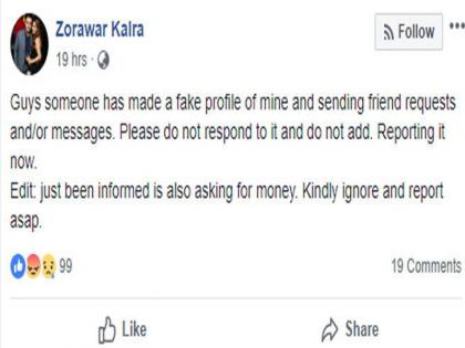 मास्टर शेफ ऑफ इंडिया या कार्यक्रमाचा होस्ट आणि मॅसिव्ह रेस्टॉरंटचे फाऊंडर जोरावर कालरा याने आपल्या अकाऊंटवर एक पोस्ट शेअर केली आहे. त्यात त्याने सांगितले की, त्याच्या नावाचं एक फेक अकाऊंट तयार करुन त्यांच्या मित्रांना मेसेज केलेत. त्यासोबतच यूजर्सने ही तक्रार केली की, 'फेसबुक'ने त्यांना व्हॉट्सअॅपवर नोटिफिकेशन पाठवून आपल्या प्रोफाईल पासवर्ड बदलण्यास सांगितले.