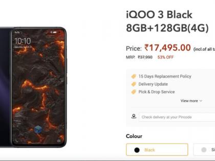 iQOO 3 5G चे सर्व व्हेरिएंटची किंमत कंपनीने अधिकृत वेबसाईटवर कमी केली आहे. iQOO 3 5G चा 8 जीबी रॅम + 128 जीबी स्टोरेज मॉडेल 17,495 रुपये, 8 जीबी रॅम + 256 जीबी स्टोरेज व्हेरिएंट 18,995 रुपये आणि 12 जीबी की रॅम + 256 जीबी स्टोरेज व्हेरिएंट 22,495 रुपयांमध्ये विकत घेता येईल. यांची किंमत अनुक्रमे 37,990 रुपये, 41,990 रुपये आणि 46,990 रुपये होती. हे फोन्स फ्लिपकार्टवर देखील उपब्लध आहेत, परंतु अजूनतरी हि नवीन किंमत फ्लिपकार्टवर लिस्ट झाली नाही.