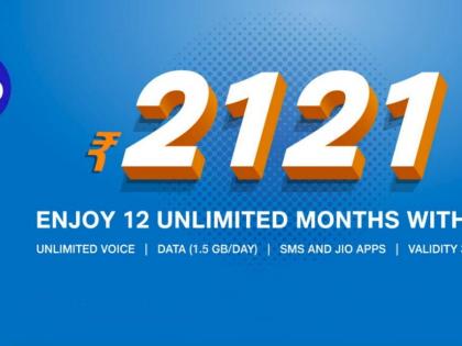 एअरटेल आणि व्होडाफोनचे १२ महिन्यांचे प्लॅन अनुक्रमे 2398 आणि 2399 रुपयांचे आहेत. याला टक्कर देण्यासाठी जिओने 2121 रुपयांत 336 दिवसांची व्हॅलिडिटी असलेला प्लॅन जाहीर केला आहे. या प्लॅनमध्ये जिओ टू जिओ अनलिमिटेड कॉलिंग आणि नॉन जिओ नेटवर्कवर बोलण्यासाठी 12000 मिनिटे देण्यात येत आहेत. तसेच प्रतिदिन 1.5 जीबी डेटा आणि 100 एसएमएस देण्यात येत आहेत. 336 दिवसांची व्हॅलिडिटी असल्याने एकूण 505 जीबी डेटा मिळणार आहे. 1.5 जीबी डेटा संपल्यानंतर इंटरनेट स्पीड 64 केबीपीएस होणार आहे. यामध्ये जीओ टीव्ही आणि जिओ सिनेमा अॅप मोफत मिळणार आहे.