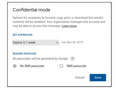 - युजर्स याशिवाय 'No SMS passcode' हा ऑप्शन सिलेक्ट करून मेसेज अनक्रिप्ट करू शकतात. मात्र Confidential Mode या फीचरच्या मदतीने पाठवलेल्या ई-मेलची प्रिंट, कॉपी, डाऊनलोक किंवा फॉरवर्ड करता येत नाही.