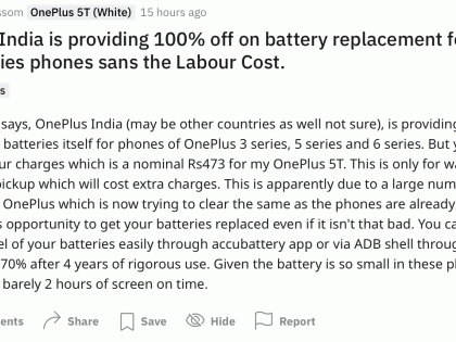 जे वनप्लस युजर्स जुना फोन दीर्घकाळ वापरण्याचा विचार करत आहेत त्यांच्यासाठी ही चांगली ऑफर आहे. रेडिटनुसार OnePlus 5T ची बॅटरी बदलून घेण्यासाठी फक्त 473 रुपये द्यावे लागतील. कंपनीने मात्र याबाबत कोणतीही अधिकृत माहिती दिली नाही. परंतु जुन्या मॉडेल्सच्या बॅटरीजचा उरलेला स्टॉक संपवण्यासाठी कंपनीने ही ऑफर आणल्याचे रेडिट पोस्टमधून समजले आहे.