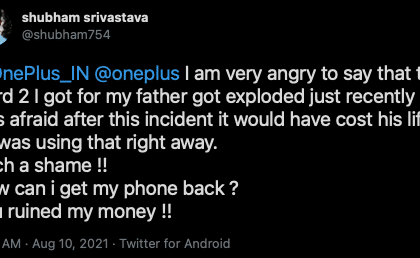 शुभम श्रीवास्तव नावाच्या ट्विटर युजरने ट्विट करून सांगितले कि त्याच्या वडिलांच्या Nord 2 स्मार्टफोनमध्ये अचानक स्फोट झाला आहे. शुभमने स्फोट झालेल्या फोनचा कोणताही फोटो शेयर केला नाही. शुभमचे वडील सरकारी अधिकारी आहेत आणि ते सुरक्षित आहेत. या दुर्घटनेमुळे कोणतेही नुकसान झाले नसले तर आपल्या वडिलांना मानसिक धक्का बसल्याचे शुभमने म्हटले आहे. या ट्विटला रिप्लाय करून वनप्लसने तपास करण्याची इच्छा व्यक्त केली आहे आणि युजरला संपर्क साधण्यास सांगितले आहे.