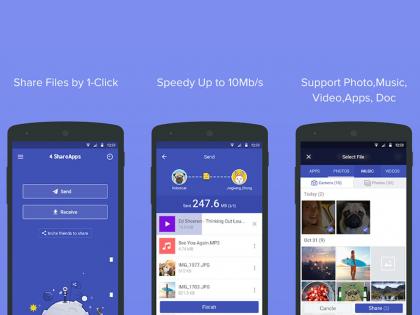 4 शेयर अॅप्स हे केवळ अँड्रॉईड डिव्हाईससाठी सपोर्ट करतं. या अॅपच्या मदतीने व्हिडीओ, फोटो, गाणी, अॅप आणि फाईल्स शेअर करता येतात. अँड्रॉईडवर या अॅपला 4.3 रेटिंग मिळालं आहे. तसेच 4 शेयर अॅप्स इंग्रजी, स्पॅनिश, थाय, इटॅलियन सारख्या 31 भाषांमध्ये सपोर्ट करतं.