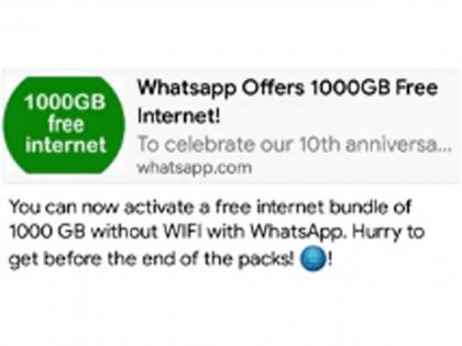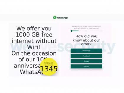 व्हॉट्सअॅपला यावर्षी 10 वर्षे पूर्ण झाली. याच गोष्टीचा फायदा घेऊन हा मेसेज व्हायरल करण्यात येत आहे. व्हॉट्सअॅप आपल्या वाढदिवसानिमित्त युजर्सना 1000GB इंटरनेट डेटा फ्री देणार अशा आशयाचा मेसेज व्हायरल होत आहे. फ्री डेटासाठी मेसेजमध्ये एक लिंकही देण्यात आली आहे. या लिंकवर क्लिक केल्यास एक पेज ओपन होतं. यामध्ये ऑफरबाबत माहिती देण्यात आली आहे.