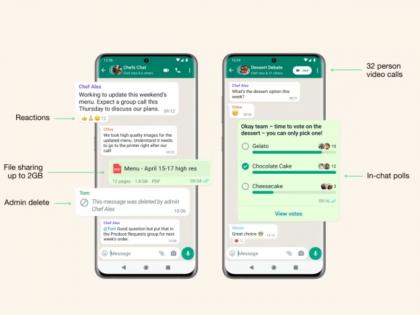 WhatsApp यूझर्स आता एकाचवेळी ३२ सदस्यांसोबत व्हिडिओ कॉल करू शकणार आहेत. याशिवाय ग्रूप साइजमध्ये वाढ करुन आता ५१२ वरुन सदस्य संख्या १०२४ इतकी करण्यात आली आहे. WhatsApp ग्रूपमध्ये इन-चॅट पोल देखील घेता येणार आहे. या फीचरच्या माध्यमातून ग्रूपमधील सदस्य एखाद्या प्रश्नावर आपलं मत नोंदवू शकणार आहेत.