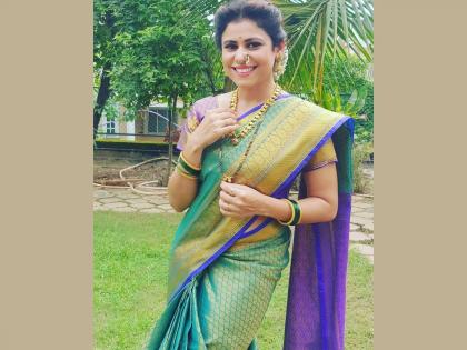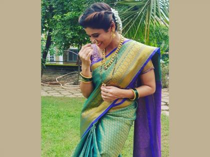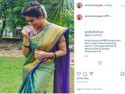 या फोटोत अश्विनीने साडी नेसली आहे. नाकात नथ, हातात हिरवा चुडा आणि गळ्यात मंगळसूत्र घातलेले दिसत आहे.
