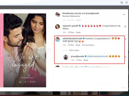 अभिषेकने कमेंट करत “मनापासून अभिनंदन...बाकी शुभेच्छा भेटून”, असं म्हटलं आहे. त्याच्या या कमेंटवर प्रसादने इमोजी शेअर करत रिप्लाय दिला आहे. अमृता-प्रसादच्या या गुडन्यूजने चाहत्यांना सुखद धक्का दिला आहे. अमृता आणि प्रसाद १८ नोव्हेंबरला लग्नबंधनात अडकणार आहेत.