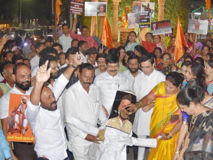 ठाणे : छत्रपती शिवाजी महाराज यांच्याविषयी अवमानकारक शब्द वापरणाऱ्या महाराष्ट्राचे राज्यपाल भगत सिंग कोश्यारी यांच्या विरोधात राज्यात पडसाद उमटत असताना, सोमवारी ठाण्यात उध्दव बाळासाहेब ठाकरे शिवसेनेच्या वतीने राज्यपालांचा निषेध करीत, त्यांच्या प्रतिकात्मक पुतळ्याला जोडे मारत आंदोलन करण्यात आले. याचदरम्यान शिवसेनेच्या रणरागिणींनी त्यांच्या पुतळ्याला पायाखाली तुडवले. यावेळी असे बेताल वक्तव्य करणाऱ्या राज्यपालांची तातडीने उचलबांगडी करावी, अशी मागणीही लावून धरण्यात आली.