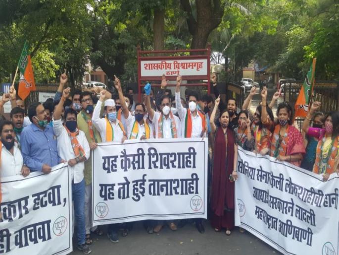 जिल्हाधिकारी कार्यालयासमोर आज दुपारी झालेल्या निदर्शनांवेळा जोरदार घोषणा देण्यात आल्या. महाविकास आघाडी सरकार हाय हाय, सोनिया सेना हाय हाय, नही चलेगी तानाशाही नही चलेगीच्या घोषणांनी कोर्टनाक्याचा परिसर दणाणून गेला. या निदर्शनांध्ये भाजपाचे प्रदेश सचिव संदिप लेले, महापालिकेतील गटनेते संजय वाघुले, मिलिंद पाटणकर, मनोहर डुंबरे, मुकेश मोकाशी, कृष्णा पाटील, सुनेश जोशी, अर्चना मणेरा, दीपा गावंड, महिला आघाडीच्या अध्यक्षा मृणाल पेंडसे, युवा मोर्चाचे सारंग मेढेकर यांच्यासह नगरसेवक-नगरसेविका, भाजपाचे पदाधिकारी-कार्यकर्त्यांसह ठाण्यातील लोकशाहीप्रेमी नागरिक उपस्थित होते.