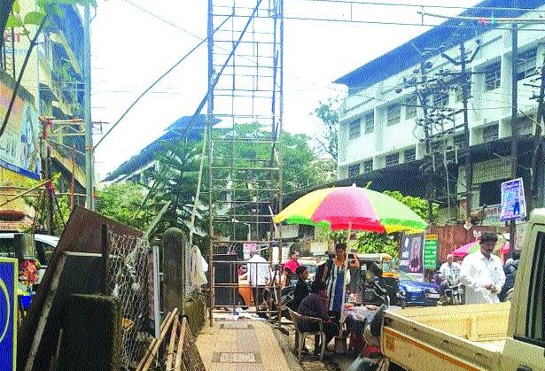 पश्चिमेकडील महात्मा फुले रोडलगतच्या भागात अर्धा रस्ता मंडपाने व्यापलेला आहे. दरवर्षी हे चित्र कायम असते. तो रहदारीचा चौक असल्याने तेथे नेहमीच वाहतूककोंडी होत असते. त्यात मंडपाची भर पडते. दरम्यान, यावेळेलाही काही ठिकाणी लोखंडी कमानी उभारण्यात आल्या आहेत. या कमानी वाहतुकीला अडथळा ठरत असताना काही कमानींनी पदपथाचा आधार घेतल्याचे पाहायला मिळत आहे.
