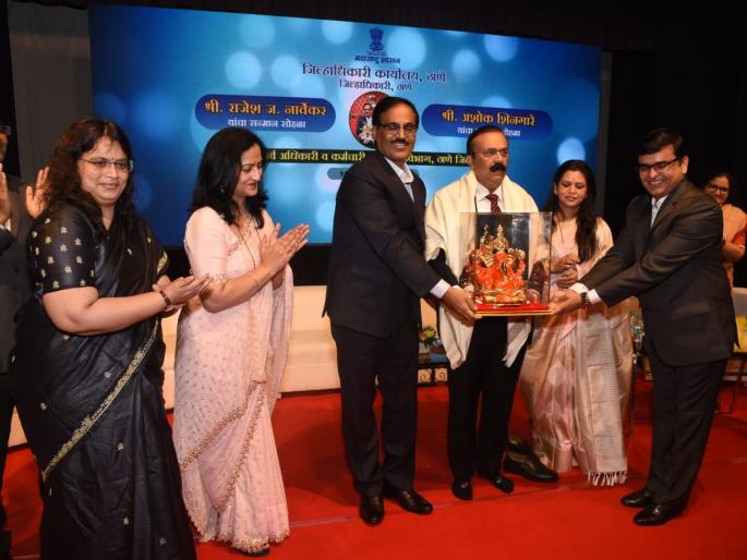 नवी मुंबई महापालिकेच्या आयुक्तपदी बदली झाल्यानिमित्त जिल्हाधिकारी राजेश नार्वेकर यांचा सन्मान आणि नवनियुक्त जिल्हाधिकारी अशोक शिनगारे यांचा स्वागत सोहळा आज येथील राम गणेश गडकरी रंगायतन येथे झाला. यावेळी सीमा नार्वेकर, स्मिता शिनगारे, अपर जिल्हाधिकारी मनीषा जायभाये, ठाणे जिल्हा जात पडताळणी समितीच्या अध्यक्षा वैदेही रानडे आदी व्यासपीठावर उपस्थित होते. यावेळी जिल्हाधिकारी अशोक शिनगारे यांचे वडील अंबादास शिनगारे यांचा नार्वेकर यांच्या हस्ते सत्कार करण्यात आला. महसूल प्रशासनाच्या वतीने नार्वेकर यांना मानपत्र देऊन सपत्नीक सत्कार करण्यात आला. नवनियुक्त जिल्हाधिकारी शिनगारे यांचाही सपत्नीक सत्कार ठाणे जिल्हा प्रशासनाकडून करण्यात आला.