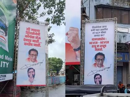 शिवसेनेला जागा कमी पडत असतील तर NCP सोबत जाणार का? असा प्रश्न बाळासाहेबांना विचारण्यात आला होता. ''NEVER-NEVER शत्रू हा शत्रूच असतो'', असं उत्तर त्यावेळी बाळासाहेबांनी दिलं होतं. याचीच आठवण करुन देणारा बॅनर लावण्यात आला आहे. बॅनरवर शिवसेना पक्षप्रमुख बाळासाहेब ठाकरे आणि त्यांची स्वाक्षरी. त्याखाली मुख्यमंत्री एकनाथ शिंदे यांचा फोटो छापण्यात आला आहे.