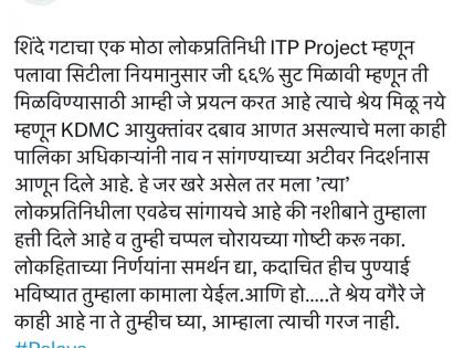 पलावा सिटी अंतर्गत येणाऱ्या २५ हजार फ्लॅट धारकांना मनपाने मालमत्ता कर न भरल्यामुळे नोटीसा पाठविल्या होत्या. आमदार पाटील यांनी बॅनर लावून मनपाच्या निर्णयाचा विरोध केला होता. मालमत्ता करात सूट मिळावी यासाठी पाटील गेले वर्षभर सातत्याने पाठपुरावा करीत आहेत. प्रशासनाने प्रतिसाद दिला पण अंमलबजावणी केली नाही. यावर पाटील यांनी चौकशी करता ज्यासाठी तुम्ही प्रयत्न करीत आहात त्याचे श्रेय तुम्हाला मिळू नये म्हणून शिंदे गटातील मोठा लोकप्रतिनिधी आयुक्तांवर दबाव आणत असल्याचे काही पालिका अधिका-यांनी नाव न सांगण्याच्या अटीवर निदर्शनास आणून दिल्याकडेही ट्विटद्वारे आमदार पाटील यांनी लक्ष वेधले आहे.