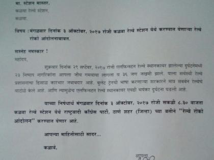 एल्फिन्स्टन रेल्वे पुलावर झालेल्या चेंगराचेंगरी दुर्घटनेची पुनरावृत्ती भविष्यात घडू नये आणि बुलेट ट्रेनऐवजी लोकलने प्रवास करणाऱ्यांच्या समस्या सोडवण्याला प्राधान्यक्रम द्यावा, यासह अन्य मागण्यांसाठी राष्ट्रवादी काँग्रेस आता रेल्वे रोखून आंदोलन केलं. कळवा रेल्वे स्थानकात हे रेल रोको आंदोलन केले जाणार असल्याची माहिती राष्ट्रवादी काँग्रेसचे आमदार जितेंद्र आव्हाड यांनी दिली होती.