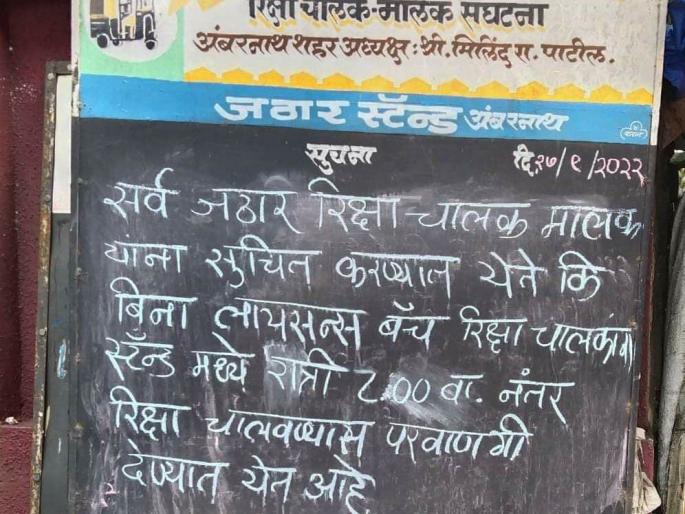 अंबरनाथ - अंबरनाथच्या नगरपालिकेजवळ असलेल्या मुख्य रिक्षा स्टँड जवळ काही रिक्षा चालकांनी युनियनच्या फलकावर सूचना लिहिली असून ती सूचना भलतीच व्हायरल झाली आहे. ज्या रिक्षा चालकांकडे बॅच आणि लायसन नाही अशा रिक्षा चालकांनी रात्री आठ नंतर स्टॅंडवर रिक्षा चालवावी अशी सूचना त्या फलकावर लावण्यात आली होती. मात्र या प्रकरणी खुद्द रिक्षा चालक-मालक संघटनेने आक्षेप नोंदवला असून असा चुकीचा प्रकार करणाऱ्यांवर कारवाई करण्याची मागणी केली आहे.