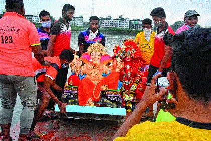 कल्याण : कोरोनाचे सावट असल्याने अनंत चतुर्दशीच्या दिवशी मंगळवारी कल्याण-डोंबिवली मनपा हद्दीत गणेश विसर्जन अत्यंत साधेपणाने पार पडले. सायंकाळी उशिरापर्यंत पाच हजार ८७५ गणेशमूर्तींचे विसर्जन करण्यात आले. यावेळी आपल्या लाडक्या गणरायाला निरोप देताना भक्त भावुक झाले होते.केडीएमसीने विविध ठिकाणी गणेश विसर्जनासाठी सोय केली होती. तसेच राबवलेल्या ‘विसर्जन आपल्या दारी’लाही चांगला प्रतिसाद मिळाला. कल्याणमधील दुर्गाडी खाडी, गणेशघाट, डोंबिवली रेतीबंदर खाडीकिनारा येथे मोठ्या प्रमाणात गणेशमूर्तींचे विसर्जन करण्यात आले. मनपा आयुक्त डॉ. विजय सूर्यवंशी यांनी दुर्गाडी खाडीकिनारा येथे भेट दिली. यावेळी त्यांच्यासोबत शहर अभियंता सपना कोळी-देवनपल्ली, अभियंता सुभाष पाटील, आयएमएचे डॉ. प्रशांत पाटील आदी मान्यवर उपस्थित होते.लहान मूर्तींच्या विसर्जनासाठी चार तराफे ठेवले होते. त्यावर मूर्ती घेऊन जाऊन कोळी बांधव खोल पाण्यात विसर्जन करत होते. तसेच मोठ्या मूर्तींचे विसर्जन करण्यासाठी दोन मोठ्या बोटींची व्यवस्था केली होती. यापैकी एका बोटीवरून आयुक्तांनी खाडीत दूरपर्यंत फेरफटका मारून विसर्जनस्थळाची पाहणी केली. विसर्जन शांततेत व शिस्तबद्ध पद्धतीने केले जात असल्याचे सांगितले. यावेळी काही पोलीस अधिकारी व कोळी बांधवांचा आयुक्तांच्या हस्ते पुष्पगुच्छ देऊन सन्मान करण्यात आला. बंदोबस्तासाठी तैनात केलेल्या पोलीस अधिकाऱ्यांपैकी पोलीस निरीक्षक अशोक पवार यांनी ‘विठू माऊली तू’ हे गीत गाऊन सगळ्यांना मंत्रमुग्ध केले. यावेळी अन्य पोलिसांनीही गीते गाऊन विसर्जनस्थळी एक भक्तिमय वातावरण निर्माण केले.भिवंडीत शांततेत दिला निरोपभिवंडी : भिवंडी शहर परिसरात मंगळवारी १० दिवसांच्या गणपतीचे शांततेत विसर्जन झाले. सार्वजनिक व घरगुती अशा एक हजार ७६३ मूर्तींचे विसर्जन करण्यात आले. ज्यामध्ये घरगुती एक हजार ६०१, सार्वजनिक १६२ मूर्तींचे विसर्जन झाले. ग्रामीण भागातही मोठ्या उत्साहात विसर्जन झाले. सुरक्षिततेच्या दृष्टीने पोलिसांनी चोख बंदोबस्त ठेवला होता. फुलांनी सजवलेल्या खाजगी वाहन व टेम्पोतून मूर्ती विसर्जनाच्या ठिकाणी आणण्यात आल्या. रात्री उशिरापर्यंत हा सोहळा भादवड, वºहाळादेवी, कामतघर, नारपोली, तलाव व काल्हेर, कोनगाव, शेलार, टिळकघाट येथे सुरू होता. आमदार रईस शेख, गणेशोत्सव महामंडळाचे अध्यक्ष मदन भोई, शांतता समिती सदस्य वसीम खान, पालिकेचे प्रभाग समिती अधिकारी दिलीप खाने, अधीक्षक मकसुद शेख, अन्य सदस्य उपस्थित होते.उल्हासनगरमध्ये साडेआठ हजार मूर्तींचे विसर्जनउल्हासनगर : दहा दिवसांच्या गणपतींचे मंगळवारी साधेपणाने विसर्जन झाले. महापालिकेच्या मूर्ती संकलन केंद्रांत
