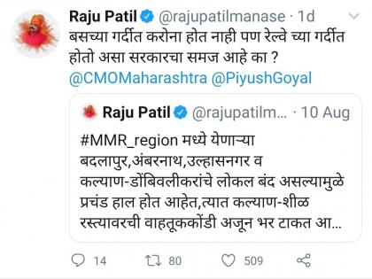 केंद्रीय रेल्वेमंत्री पियुष गोयल आणि राज्याचे मुख्यमंत्री उद्धव ठाकरे यांना राजू पाटील यांनी ट्विट करत हा सवाल विचारला असून सर्वसामान्य प्रवाशांसाठी लवकरात लवकर लोकलसेवा सुरू करण्याची मागणी केली आहे. बदलापूर,अंबरनाथ, कल्याण,डोंबिवली आणि दिवा येथील नागरिक बससाठी तासनतास रांगा लावत आहेत, रस्त्यावर पडलेले खड्डे, वाहतूक कोंडी यामध्ये सर्वसामान्य प्रवासी भरडला जात असून 5 ते 6 हजार भाड्याचा खर्च होतो ते कसे परवडेल असेही पाटील म्हणाले. सरकारने दिलासा द्यावा, असं राजू पाटील यांनी म्हटलंय.