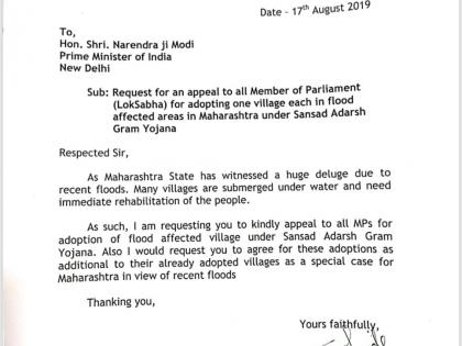 डोंबिवली - महाराष्ट्र राज्यात झालेल्या अतिवृष्टीमुळे पुरपरिस्थिती निर्माण होऊन अनेक गावांचे मोठ्या प्रमाणावर नुकसान झाले आहे. या गावांना परिस्थितीतून पूर्वपदापर्यंत आणण्यासाठी महाराष्ट्रातील सर्व खासदारांनी सांसद आदर्श गाव योजने अंतर्गत त्यांचा मतदारसंघ सोडून इतर मतदारसंघातील अथवा जिल्ह्यातील एक गाव दत्तक घ्यावे, अशी मागणी खासदारश्रीकांत शिंदे यांनी केली आहे.