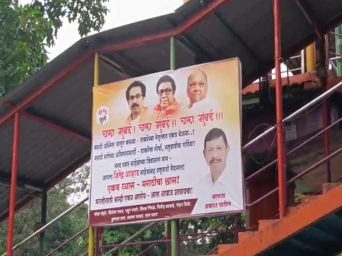 यानंतर ठाण्यामध्ये शनिवारी सकाळीच त्यानिमित्ताने बॅनरबाजी पाहायला मिळाली. शरद पवार गटाचे ठाणे कार्याध्यक्ष प्रकाश पाटील यांच्या वतीने ठाण्यातील, कळवा नाका, छत्रपती शिवाजी महाराज रुग्णालय, स्टेशन रोड आदी परिसरात बॅनर लावण्यात आले आहेत. या बॅनरवर राज ठाकरे उद्धव ठाकरे सह शरद पवारांचे छायाचित्र आहे. या बॅनरवर चला मुंबई,मराठी अस्मिता जागृत करूया ठाकरेच्या नेतृत्वात मोर्चा सामील होऊया! मराठी भाषेच्या अभिमानासाठी ठाकरेंचा मोर्चा राष्ट्रवादीचा पाठिंबा! शरद पवार साहेबांच्या विचाराचा मान! जितेंद्र आव्हाड यांच्यासह राष्ट्रवादी मैदानात! एक श्वास मराठीचा ध्यास! मराठीसाठी आम्ही एकत्र आलोय आता आवाज उठवायचा असा देखील मजकूर लिहिला आहे.