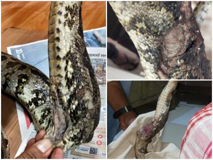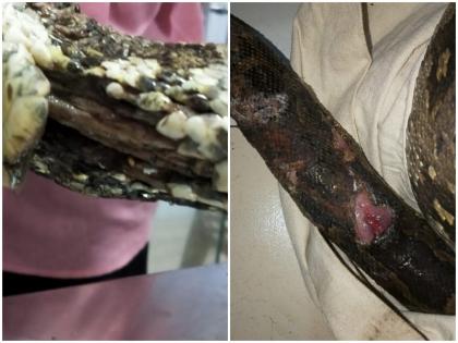 Python Rescue : सर्प मित्र ज्ञानेश्वर शिरसाठ आणि चंद्रकांत कांगराळकर घटनास्थळी पोहोचताच, अडकलेला अजगर, ही मादी (Female) आहे, असे त्यांच्या लक्षात आले. ती जखमी होती. तिच्या जखमांना मेगोट्स झाले होते.