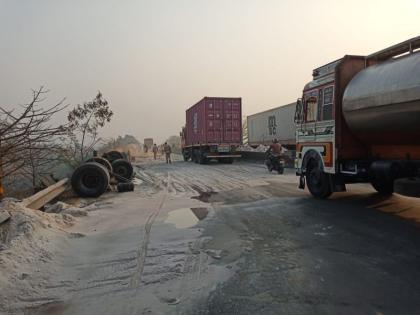 स्टेअरिंग लॉक झाल्याने कंटेनर उलटल्याची माहिती मिळत आहे. सोमवारी ट्रक उलटून झालेल्या अपघातानंतर गाड्यांच्या रांगा लागल्या आहेत. घटनेची माहिती मिळताच अग्निशमन दल घटनास्थळी दाखल झाले असून वाहतूक पूर्ववत करण्यात येत आहे.