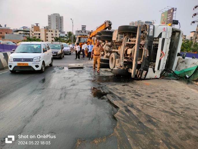 ठाण्यात माजीवडा ओव्हरब्रिजवर ट्रक उलटल्याने वाहतूक कोंडी