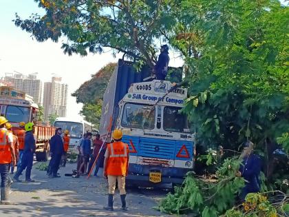 कापूरबावडी येथे कंटेनरने झाडाला धडक दिल्याने ते झाड पडले. या घटनेने वाहतूक कोंडी झाल्याची माहिती मिळताच घटनास्थळी कापूरबावडी वाहतूक पोलीस, वृक्षप्राधिकरण विभागाचे कर्मचारी, आपत्ती व्यवस्थापन विभाग, महावितरण विभागासह अग्निशमन दलाच्या जवानांनी धाव घेतली. तब्बल एक तासांच्या प्रयत्नांनतर आपत्ती व्यवस्थापन विभाग आणि अग्निशमन दलाच्या पथकांनी कंटेनर आणि वीज वितरणच्या खांबावर पडलेले झाड कापून ते बाजूला केले. त्यानंतर या मार्गावरील वाहतूक हळूहळू सुरळीत झाली. या घटनेत सुदैवाने कोणालाही दुखापत झाली नाही. मे. एसजेए लॉजिसल इंडिया प्रायव्हेट लिमिटेडचा हा कंटेनर घेऊन शिवकुमार यादव हा चालक २५-टन पॉलिस्टर टेक्सचराइज्ड धागा दमणवरून न्हावाशेवा येथे निघाला होता. त्याचवेळी हा अपघात घडल्याची माहिती पोलिसांनी दिली.