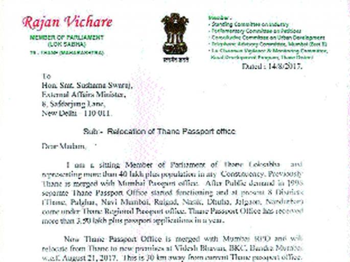 मुंबईत हे कार्यालय गेल्यास सगळ्यांनाच त्याचा त्रास होणार असल्याचे विचारे यांनी नमूद केले. परराष्ट्रमंत्री सुषमा स्वराज यांना पत्र लिहून ठाणे पासपोर्ट कार्यालय सुरू ठेवा, अशी विनंती केल्याचे विचारे यांनी स्पष्ट केले.