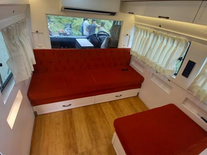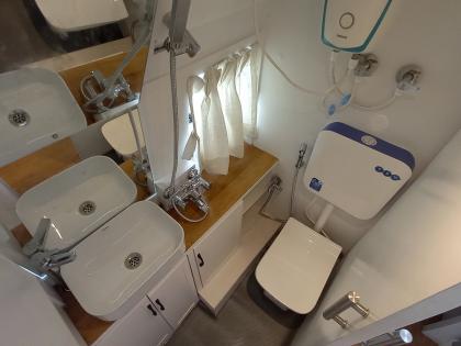 ओवन, गॅसशेगडी, फ्रीज, भांड्याकुंड्यासह अख्खं स्वयंपाकघर. टीव्ही. दोन बेड्स कम सोफासेट. प्रत्येक बेडवर दोन मोठ्या व्यक्ती आणि एक लहान मूल असे तिघे आराम करू शकतील एवढा स्पेस. शॉवर, कमोडसह बाथरुम. कपडे, इतर साहित्य ठेवण्यासाठी स्टोरेजची व्यवस्था. पिण्यासह सांडपाण्याची व्यवस्था. एसी, टीव्हीसह गाडीतील सर्व उपकरणे २४तास चालतील एवढा एनर्जी बॅकअप. शिवाय पूर्णवेळ वायफाय सुविधादेखील.