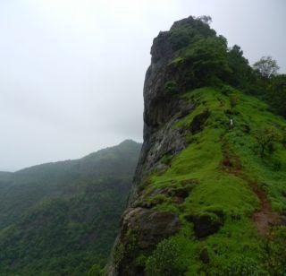 मग आम्ही एक सुळक्यावजा दगडाच्या जवळ जाऊन तिथे आधीपासून रोवून ठेवलेल्या झेंड्याला हात लावून फोटो काढले. पाणी वगैरे पिऊन जरा तरतरीत झाल्यावर परतीच्या मार्गाला लागलो. उतरताना काही ठिकाणी मध्ये येणार्या झाडांच्या फांद्यांमुळे खरचटले तरी त्याची कोणाला पर्वा नव्हती.एकामागोमाग एक उतरत होतो आम्ही सगळे. अशा वेळी एकी हीच कामी येते. कारण ज्या मार्गाने आम्ही चढत गेलो त्यातील गडाच्या माथ्यापासूनचा अर्धा टप्पा आम्ही परतीच्या प्रवासात पार केला, पण पुढे वाट चुकली आणि आमच्यासमोर मोठे प्रश्नचिन्ह उभे राहिले कि आता काय करायचे खाली कसे उतरायचे? पण गजानन ने आम्हाला धीर देऊन काही मार्ग दिसतोय का पाहतो असे सांगितले. तो म्हणाला,‘ अरे, असे प्रसंग येतच असतात.त्यामुळे खचून न जाता त्यातून बाहेर कसे पडता येते याकडे लक्ष केंद्रीत करा.’ त्याने हळू हळू पुढे होत रस्ता शोधून काढला आणि आम्हाला मागोमाग येण्यासाठी इशारा केला. आम्ही दोघे तिथपर्यंत गेलो रस्ता पाहायला, पण तो अतिशय धोकादायक उतरणीचा होता. मी थोडा घाबरलो होतो.पण अनिरुद्ध आणि गजाननने धीर दिल्यामुळे तयार झालो. एक तासाच्या खडतर उतरणीनंतर आम्हाला एक मंदिर दिसलं, पण ते आम्ही उभे होतो तिथून खूप दूर होतं.