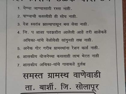 उस्मानाबाद मतदारसंघातील आणि बार्शी तालुक्यातील वाणेवाडी हे गाव सध्या चर्चेत आहे. या गावातील ग्रामस्थांनी मतदान न करण्याचा निर्णय एकमताने घेतला असून सर्वच गावकरी आपल्या निर्णयावर ठाम आहेत. साधारणत: 1200 ते 1300 लोकसंख्या आणि 800 मतदान असलेल्या या गावात अनेक स्थानिक नेत्यांनी संपर्क केला. मात्र, अद्याप गावकरी मानायला तयार नाहीत. ग्रामस्थांनी चक्क गावाच्या बाहेर एक डीजिटल फलक झळकावला आहे. त्यामध्ये वाणेवाडी ग्रामस्थांचा लोकसभा आणि विधानसभा निवडणुकांवर बहिष्कार असे लिहिले आहे. तसेच, गावकऱ्यांकडून पत्रेकही छापण्यात आली आहेत. त्या पत्रकारवरही ''अभी नही तो कभी नही'' असा संदेश लिहून गावातील समस्यांची यादीच देण्यात आली आहे.
