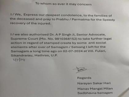 नारायण साकार हरी अर्थात भोले बाबा यांनी आपल्या वकिलामार्फत निवेदन जारी करत म्हटले आहे की, आम्ही मृतांच्या कुटुंबीयांप्रति तीव्र संवेदना व्यक्त करतो आणि परमेश्वराकडे जखमी लोक लवकरात लवकर बरे व्हावेत, यासाठी प्रार्थना करतो. चेंगराचेंगरीसाठी जबाबदार असलेल्या समाजकंटकांवर कायदेशीर कारवाई करण्यासाठी सरर्वोच्च न्यायालयाचे वरिष्ठ वकील डॉ एपी सिंह यांना नेमन्यात आले आहे. तसेच, आपण 2 जुलैला हाथरसमधील फुलरई येथे आयोजित करण्यात आलेल्या सत्संगाच्या कार्यक्रमातून खूप आधीच निघून गेलो होतो, असेही भोले बाबा यांनी म्हटले आहे.