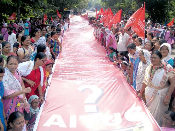 या मोर्चाचे नेतृत्त्व आयटकचे राज्यसचिव दिलीप उटाणे, जिल्हासंघटक असलम पठाण यांनी केले. मोर्चा दुपारी २ वाजताच्या सुमारास न्यायालयाच्या मुख्यद्वारासमोर आला असता पोलिसांनी तो अडविला. त्यानंतर आंदोलनकर्त्यांच्या शिष्टमंडळाने ५० फुट लांबीचे ३५ मागण्यांचा समावेश असलेले निवेदन जिल्हाधिकाºयांना सादर केले. सदर निवेदन निवासी उपजिल्हाधिकारी मंगेश जोशी यांनी स्वीकारले.