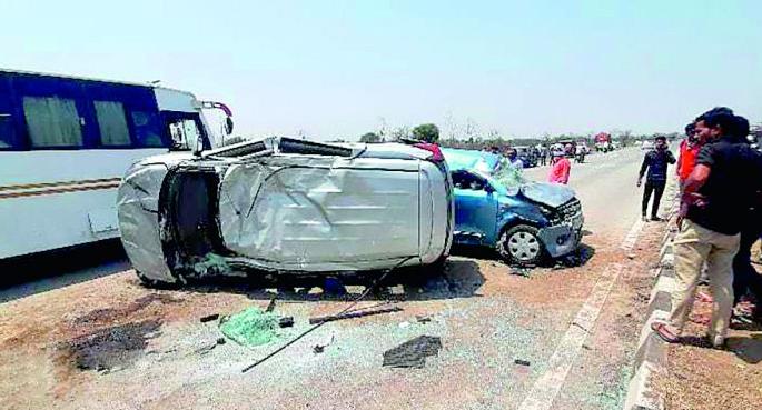 लोकमत न्यूज नेटवर्कपवनार : भरधाव कारचा समोरील टायर फुटल्याने कार दुभाजकावर जाऊन विरुद्ध दिशेने जाणाऱ्या कारवर जाऊन धडकल्याने झालेल्या अपघातात सातजण गंभीर जखमी झाले. हा अपघात रविवारी (दि.१७) सकाळी १०.३६ वाजण्याच्या सुमारास वर्धा-नागपूर रस्त्यावर असलेल्या मामा-भांजा दर्गाह समोर झाला. अपघातात गंभीर जखमी झालेल्यांत रमेशराज कपाटे (६०), शिला कृष्णराज कपाटे (५५), चेताबाई कपाटे (७०), कोमल कृष्णराज कपाटे (२१), योगेश कपाटे (२५) सर्व, रा. पारशिवणी जि. नागपूर यांचा समावेश आहे. तर नागपूरच्या दिशेने जाणाऱ्या कारमधील दोन जखमींची नावे वृत्त लिहिस्तोवर स्पष्ट झाली नव्हती.प्राप्त माहितीनुसार, एम. एच. ३२ ए. एस. ०६८७ क्रमांकाची कार वर्धेकडून नागपूरकडे जात होती. दरम्यान, माहूर येथे देव दर्शनासाठी जात असलेल्या एम. एच. ४० सी. ए. ४२६७ क्रमांकाच्या कारचा नागपूर-यवतमाळ मार्गावरील मामा-भांजा दर्गाह समोर उजव्या बाजूचा समोरील टायर फुटल्याने ती कार अनियंत्रित होऊन थेट रस्ता दुभाजकावर जाऊन आदळली आणि चक्क वर्ध्याकडून नागपूरकडे जाणाऱ्या एम.एच. ३२ ए. एस. ०६८७ क्रमांकाच्या कारवर जाऊन धडकली. अपघात झाल्याचे लक्षात येताच परिसरातील नागरिकांनी घटनास्थळाकडे धाव घेत जखमींना रुग्णवाहिकेला पाचारण करून सेवाग्राम येथील रुग्णालयात उपचारांसाठी पाठविले. तर देव दर्शनाला जाणाऱ्या कपाटे कुटुंबातील सदस्यांची प्रकृती गंभीर असल्याने त्यांना नागपूर येथील रुग्णालयात उपचारार्थ पाठविण्यात आल्याची माहिती मिळाली. अपघात इतका भीषण होता की, दोन्ही कारचा चक्काचूर झाला. तीन जखमींना बसपाचे जिल्हाध्यक्ष मोहन राईकवार, अनोदर्शी भैसारे, दीपक भगत, दिनेश वाणी, राहुल काशिकर, राहुल खोब्रगडे यांनी रुग्णालयात पाठविण्यासाठी मदत केली. अपघाताची माहिती मिळताच सेवाग्राम पोलिसांनी घटनास्थळ गाठून पंचनामा केला.
