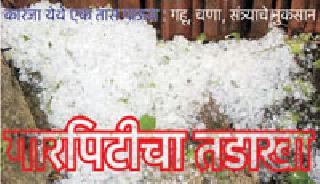 वर्धा : अवकाळी पाऊस व गारपीट यंदा शेतकऱ्याची पाठ सोडत नसल्याचे दिसून येत आहे. गत दोन महिन्यापासून जिल्ह्यात वादळी पावसाने थैमान घातले आहे. जुन्या आठवणी शेतकरी विसरत नाही तोच रविवारी पुन्हा गारपिटीचा तडाखा बसला. दुपारी ३ वाजतापासून सुरू झालेला हा पाऊस रात्री ८ वाजेपर्यंत सुरू होता. यावेळी जिल्ह्यातील विविध भागात बोराच्या आकाराच्या गारी पडल्या. या गारपिटीमुळे शेतात उभ्या असलेल्या गव्हासह चणा व इतर पिकांचे मोठे नुकसान झाले. जिल्ह्यात वर्धा, सेलू, देवळी, कारंजा (घाडगे) व आर्वी या भागाला गारपिटीचा चांगलाच तडाखा बसला. वर्धेत सायंकाळी ५ वाजताच्या सुमारास आलेल्या पावसात गारपीट झाली. यावेळी असलेल्या वाऱ्यामुळे शहरातील वंजारी चौक व आर्वी नाका परिसरात विद्यूत तारा तुटल्याले काही काळ वीज पुरवठा खंडीत झाला होता. वर्धेतील रस्त्याच्या कडेला गारांचा खच साचला होता. तर सालोड (हिरापूर) येथे पावसात सापडलेले दोघे जखमी झाले. कारंजा तालुक्यातील धर्ती, भालु, बोरी, सोनेगांव या गावांना गारपिटीचा फटका बसला होता. तालुक्याच्या शेवटच्या टोकावर असलेल्या मेटहिरजी या गावाला १ तास गारपिटीने झोडपले. येथील हजारावर हेक्टर शेतीपिकाचे नुकसान झाल्याचा अंदाज वर्तविल्या जात आहे. सुमारे एक तास वादळी वारा व पावसाने जनजीवन विस्कळीत झाले. गारपीटीने शंभरच्यावर घरांचे कवेलू फुटल्याचे येथील विनोद सिरसाम यांनी सांगितले. येथीलच जगदीश डोये यांच्या शेतातील ३ एकर गहु व चना भूईसपाट झाला. येथील जमीन शंभर टक्के ओलिताची असल्याने संत्रा, गहु, चणा पीक घेतात. ऐन कापणीच्या वेळी बसलेल्या गारपिटीच्या तडाख्यामुळे त्यांना चांगलाच फटका बसला. गावातील अनेक घरावरील कवेलु फुटुन पाणी घरात शिरल्याने घरातील साहित्याची नासधुस झाली. देवळी तालुक्यातील सोनेगाव (आबाजी), चिकणी, जामणी, नागझरी, इंझाळा आदी गावात १५ ते २० मिनीटपर्यंत बोर व आवळ्याच्या आकाराच्या गारा पडल्या. सोनेगाव आबाजी येथील उदय काशीकर यांचा दोन एकरातील कांदा जमीनदोस्त होऊन त्यांचे दोन लाखाचे नुकसान झाले. तसेच चिकणी व जामणी येथे सुद्धा १५ ते २० मिनीटपर्यंत गारा होऊन पिकांचे नुकसान झाले. त्याचप्रमाणे नागझरी व इंझाळा येथे तुरीचे आकाराच्या गारा व वादळी पाऊस झाला. सेलू तालुक्यातील रेहकी, सुरगाव या भागात सायंकाळी ५ वाजताच्या सुमारास पावसाने हजेरी लावली. यावेळी गारपीट झाल्याने शेतातील पिकांचे नुकसान झाले. शिवाय बऱ्याच शेतकऱ्यांनी त्यांच्या शेतात सवंगनी करून ठेवलेला गहू ओला झाल्याने नुकसान सोसावे लागले. आर्वी तालुक्यातील पिंपळखुटा, तरोडा, बोथली या तीन गावांमध्ये वादळी वाऱ्यासह आलेल्या पावसाचा चांगलात तडाखा बसला. दुपारी ३ वाजताच्या सुमारास पाव