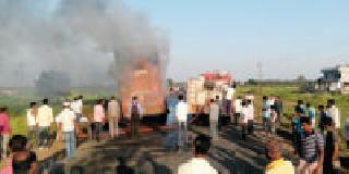 कंटेनर पेटला... चेन्नई येथून कोरबा येथे कार घेवून जात असलेल्या कंटेनरने रविवारी वर्धेत नागपूर-यवतमाळ बायपासवर पेट घेतला. यात कंटेनरमध्ये असलेल्या एकूण नऊ नव्याकोऱ्या कारचा कोळसा झाला. यावेळी लागलेली आग विझविताना अग्निशमन दलाचे जवान व झालेली गर्दी.