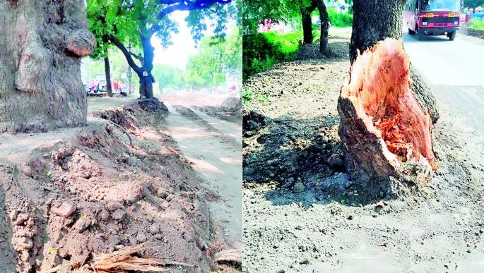 लोकमत न्यूज नेटवर्कवर्धा : सेवाग्राम विकास आराखड्यांतर्गत सुरू असलेल्या रस्ता रूंदीकरणाच्या कामादरम्यान होणाऱ्या वृक्ष कटाईला राज्याचे सार्वजनिक बांधकाम मंत्री अशोक चव्हाण यांनी स्थगिती दिली. या कामाबाबत फेरविचार करण्यासाठी सचिवस्तरीय समिती नेमण्यात आली. बांधकाम विभाग सचिव उल्हास देबडवार यांच्या अध्यक्षतेखालील या समितीने वर्ध्यात वृक्ष बचाओ नागरिक समितीची भूमिका समजून घेत एकही वृक्ष तोडला जाणार नाही तसेच झाडांना कोणतीही इजा होणार नाही याची दक्षता घेतली जाईल, याबाबत याच सभेत आश्वस्त केले. मात्र अवघ्या दहा दिवसातच पुन्हा वृक्षतोड सुरू झाल्यामुळे नागरिक समितीने तीव्र नाराजी व्यक्त केली आहे.सध्या गोपुरी चौकात रस्ता रूंदीकरणाचे काम सुरू असून या भागात रात्रीतून दोन झाडे तोडण्यात आल्याचे दिसून आले. तर याच मार्गावरील काही मोठ्या झाडांची मुळे कापण्यात आली असून काही हिरव्या झाडांच्या खोडावरील साली काढल्या गेल्याने या झाडांना क्षती पोचली आहे. दत्तपूर ते सेवाग्राम या मार्गावरील झाडांच्या उघड्या पडलेल्या मुळ्यांनाही माती टाकून संरक्षित करण्याचे सचिवांच्या उपस्थित झालेल्या सभेत ठरलेले असताना सार्वजनिक बांधकाम विभागाने घेतलेल्या या पवित्र्याबद्दल निसर्गप्रेमी नागरिकांनी खेद व्यक्त केला आहे. विशेष म्हणजे रस्त्याच्या कडेला असणाºया वृक्षाभोवती दीड मीटर परिघात खोदकाम न करण्याचेही याच सभेत निश्चित करण्यात आले होते. तसेच झाडांभोवती खोदकाम करणे गरजेचेच असेल तर मोठ्या यंत्रांचा वापर न करता मानवी श्रमातून हे काम केले जावे, याबाबतही या सभेत चर्चा करण्यात आली होती. मात्र या सर्व सूचनांना हरताळ फासत आणि निर्णयांचा अवमान करीत ठेकेदारी पद्धतीने कामे करण्यात येत आहे.ज्या महात्मा गांधींनी पर्यावरणाबाबत जागृत राहून या परिसरात मोठ्या प्रमाणात कडुलिंबाची झाडे लावली, त्या महात्म्याची जयंती वृक्षांना संरक्षण देऊन साजरी करावी, असे आवाहन वृक्ष बचाओ नागरिक समितीद्वारे करण्यात आले आहे. गोपुरी परिसरात वृक्ष तोडण्यात आल्याने परिसरातील नागरिकांनी संताप व्यक्त केला.