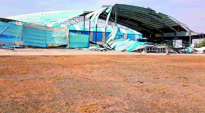 लोकमत न्यूज नेटवर्कहिंगणघाट : नजीकच्या कडाजना शिवारातील गोल्हर जिनिंग अॅण्ड ऑइल प्रायव्हेट लिमिटेडच्या ३० हजार चौरस फुटातील टिन शेड शनिवारी रात्रीच्या सुमारास आलेल्या वादळी वाऱ्यामुळे कोसळले. यात जवळपास १ कोटी ३ लाख रुपयांचे नुकसान झाले.शनिवारी रात्री ११ ते १२ वाजताच्या सुमारास विजेच्या कडकडाटात वादळी वाऱ्यासह पावसाने एक तास थैमान घातले. यात गोल्हर जिंनिंगचे सुमारे तीस हजार चौरस फुटांचे टिन शेड कोसळले तसेच इतर साहित्याचे मोठ्या प्रमाणावर नुकसान झाले. वादळाचा जोर एवढा प्रचंड होता की शेडचे अनेक लोखंडी अँगल वाकून शेड जमीनदोस्त झाले. तसेच अनेक टिनपत्रे उडून शेजारच्या शेतात पडले. रात्रीची वेळ असल्याने सुदैवाने कुठल्याही प्रकारची जीवितहानी झाली नाही.घटनेविषयी सकाळी सहा वाजता गोल्हर जिंनिंगचे संचालक धनराज गोल्हर यांनी संबंधित विभागाला माहिती कळविली. तलाठी भोंग यांनी घटनास्थळावर येऊन पंचनामा केला. यात तीन हजार चौरस फुटांवरील सुमारे ७५ टक्के शेड नुकसानग्रस्त होऊन १ कोटी रुपयांचे नुकसान झाले. तसेच हॉपर, कवडी क्लीनर सहित ५ लाख, वीज उपकरणे २ लाख व फायर पाइप १० हजार असे एकूण १ कोटी ६ लाख १० हजार रुपयांचे नुकसान झाले. विजेच्या कडकडाटासह वादळी वारा आणि पावसामुळे काही काळाकरिता परिसरातील वीजपुरवठा खंडित होता. वादळवाºयामुळे मात्र, कुठलीही जीवहानी झाली नाही.आर्वी परिसरात विजेचा लपंडावदेउरवाडा/आर्वी - तालुक्यात शनिवारी रात्रीच्या सुमारास विजेच्या कडकडाटासह आलेल्या जोरदार वाºयामुळे वीजपुरवठा वारंवार खंडित झाला. शनिवारी रात्री व पहाटे वाऱ्यासह हलक्या स्वरुपात पावसाच्या सरी आल्याने परिसरातील विद्युत पुरवठा काही काळाकरिता खंडित झाला होता. पाऊस झाल्याने वातावरणात उकाडा निर्माण झाला. लहान मुले व वयोवृद्ध यांना उकाड्याने हैराण केले. जोरदार वाºयामुळे आर्वी शहरातील पथदिवेही बंद झाले होते. वादळाने शिरपूर परिसरातील काही झाडे पडली तर अनेक अस्थायी दुकानांचे छत उडून गेले होते. नगरपालिका आणि वीज महावितरणचे कर्मचारी रविवारी सकाळी पथदिव्यांची दुरुस्ती करण्यासह वीजपुरवठा सुरळीत करण्याकरिता युद्धपातळीवर काम करीत होते. या वादळीवाऱ्यामुळे कुठलीही जीवितहानी मात्र झाली नाही.मांडगावात नागरिकांना अंधारातच काढावी लागली रात्रशनिवारी रात्री मांडगाव शिवारात वादळी वाऱ्यासह विजेच्या कडकडाटात झालेल्या पावसामुळे जनजीवन विस्कळीत झाले. रात्री ११.३० वाजताच्या सुमारास अचानक वातावरणात बदल होऊन मेघगर्जनेसह दोन ते अडीच तास जोरदार पाऊस झाला. विजांचा कडकडाट, वादळीवाऱ्यामुळे वीज वाहिन्यात बिघाड निर्माण होत रात्री १०.३० ला विद्युत पुरवठा खंडित झाला. संपूर्ण गाव